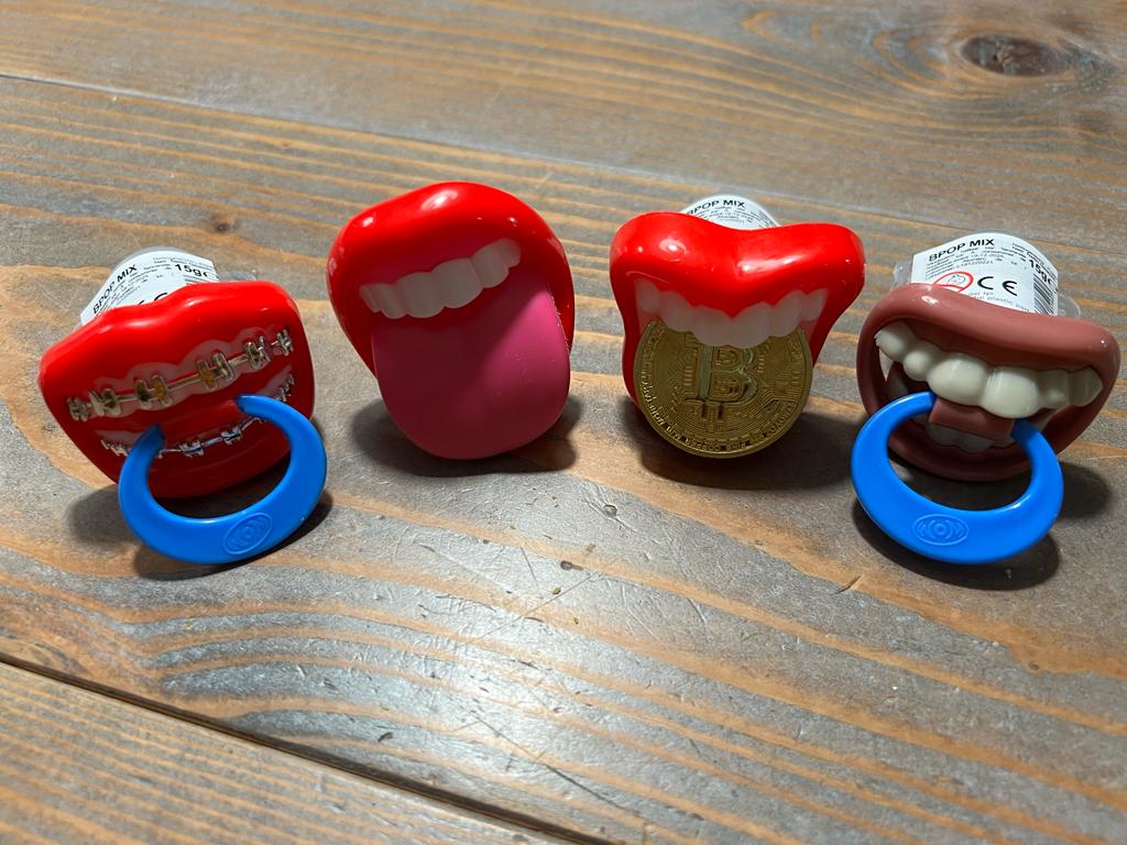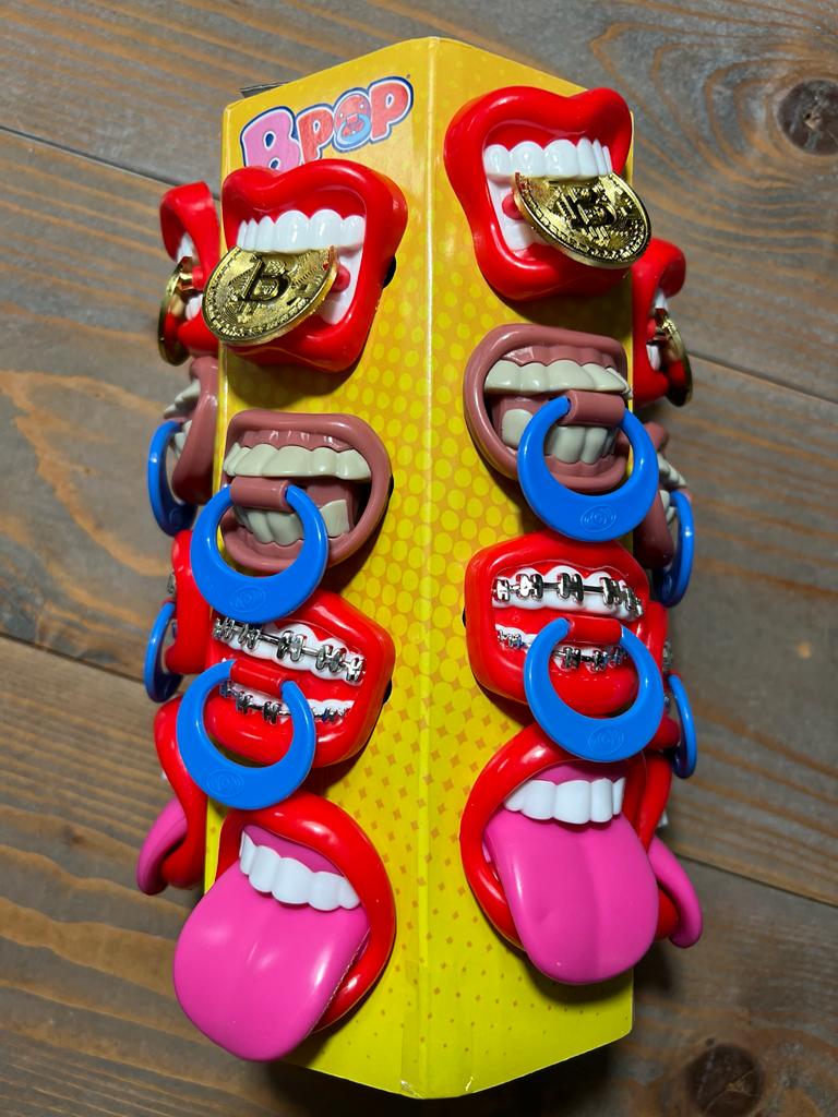 Veelkleurige lippen lolly.snoep. De lolly is bevestigd aan een plastic steun in de vorm van kussende lippen. Beschermende plastic dop die het snoep sluit en verzegelt.