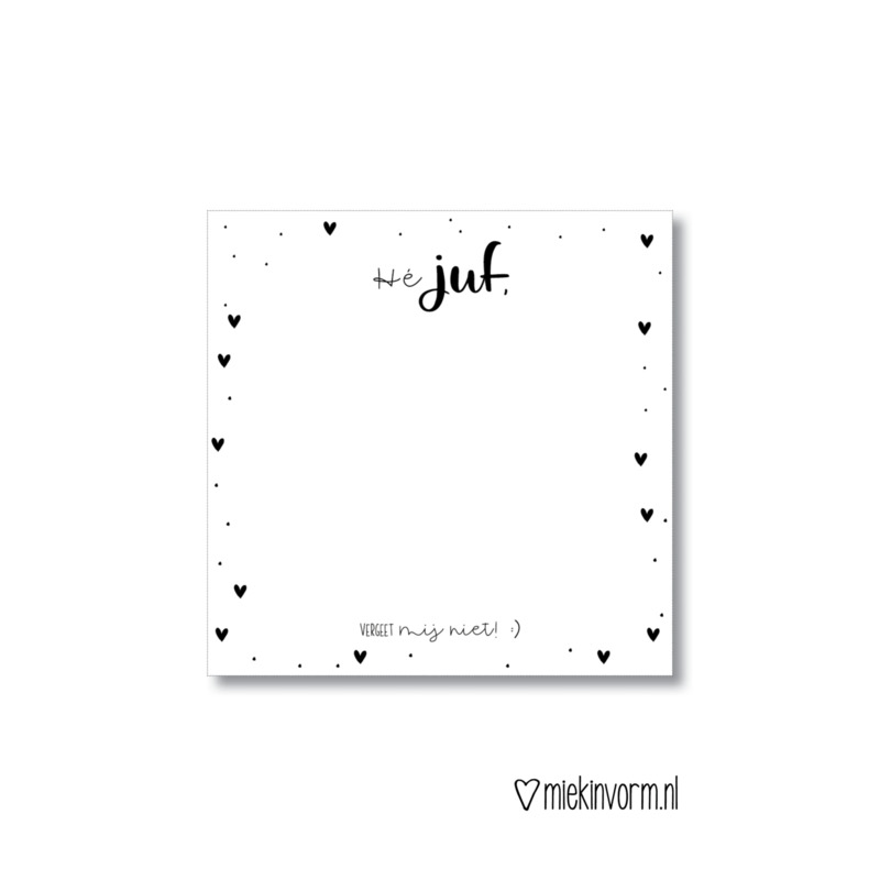 Het bevat 50 vellen, en is op elke pagina bedrukt met de tekst “Hé juf” & “Vergeet mij niet:)”