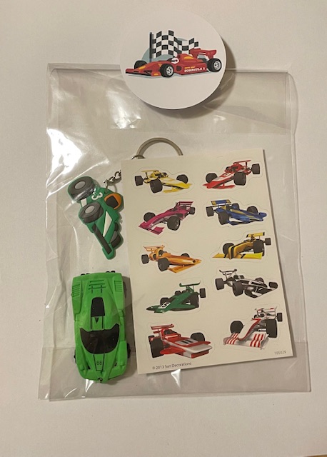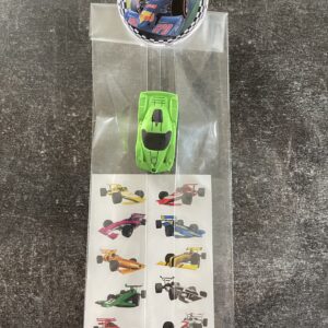 In een cellofaan zakje die sluit met een knijper van Formule 1/race auto